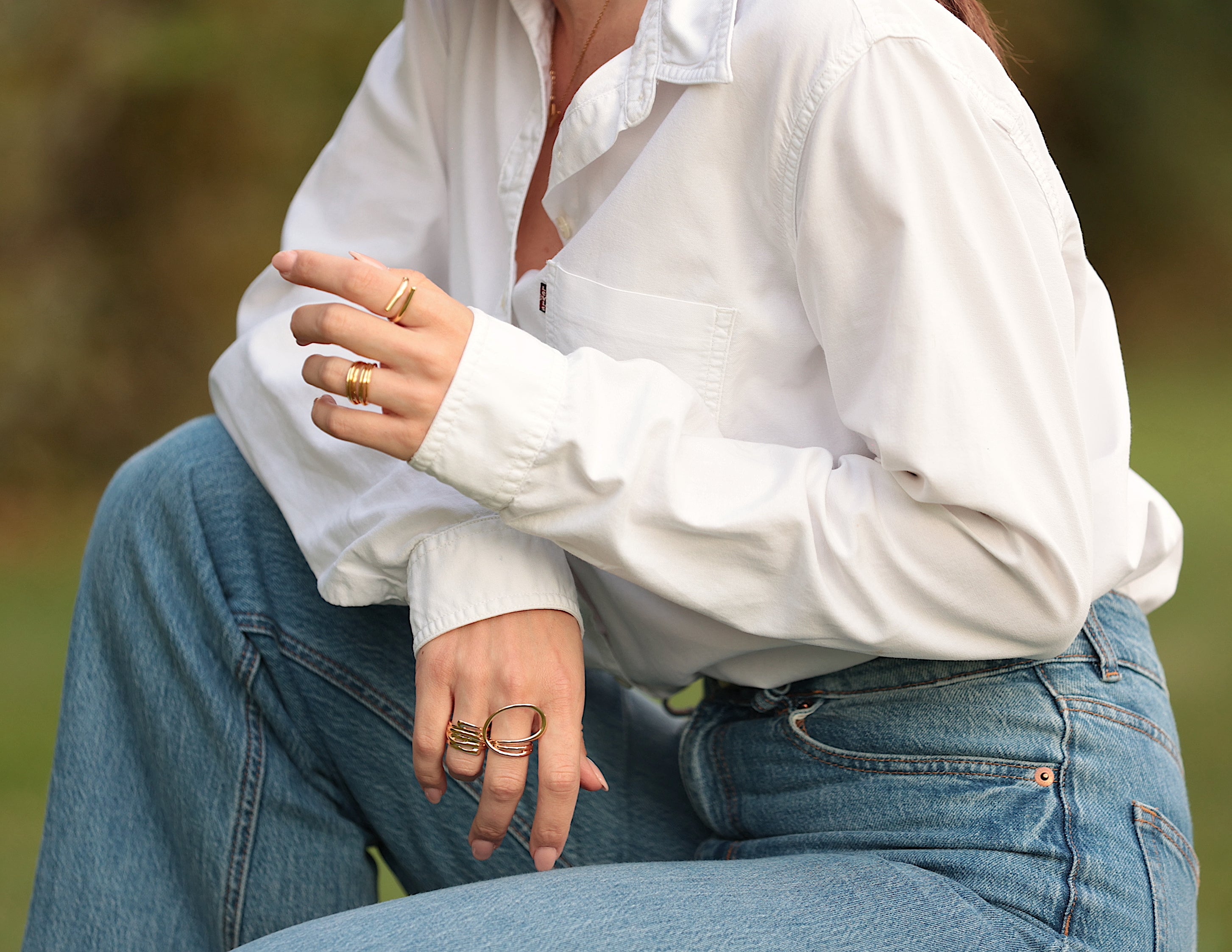 Dieses Ringset bietet einen stilvollen Kontrast mit einem auffälligen Mittelstück, einem großen kreisförmigen Ring, der die Aufmerksamkeit auf sich zieht, gepaart mit einem dezenteren, aber breiten Band. Das Ensemble schafft eine harmonische Balance zwischen Aussage und Schlichtheit und macht es zu einer vielseitigen und auffälligen Ergänzung jeder Schmuckkollektion.