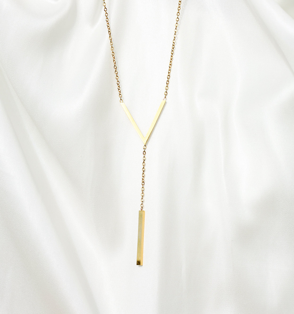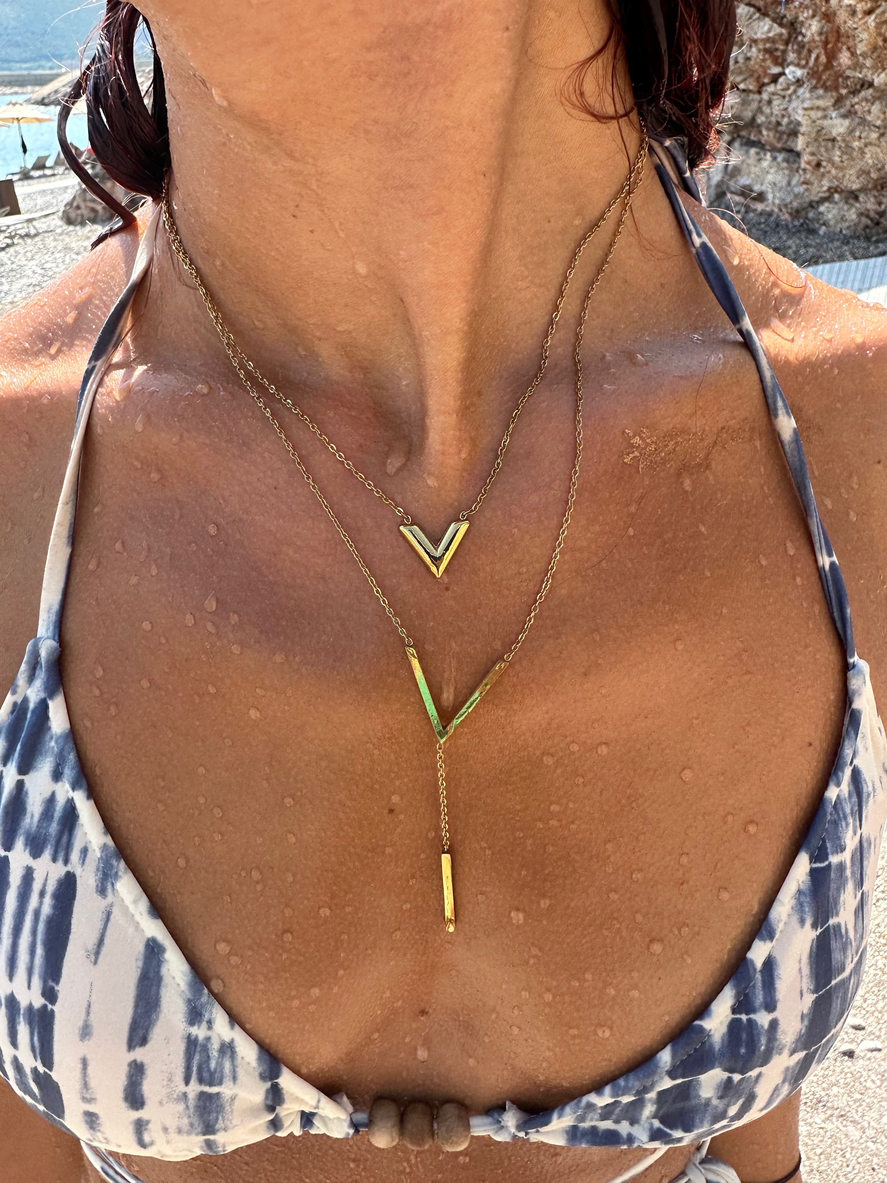 Die Stahl-Halskette mit V-Anhänger von Steine verkörpert moderne Eleganz. Die aus hochwertigem Edelstahl gefertigte Halskette präsentiert sich mit einem eleganten V-förmigen Anhänger. Das Besondere daran ist die Kette, die kunstvoll durch den oberen Teil des V verläuft und ein unverwechselbares und auffälliges Design schafft. Dieses Accessoire verbindet nahtlos modernen Stil mit zeitloser Raffinesse und ist damit ein Muss für alle, die ein einzigartiges und raffiniertes Accessoire suchen.